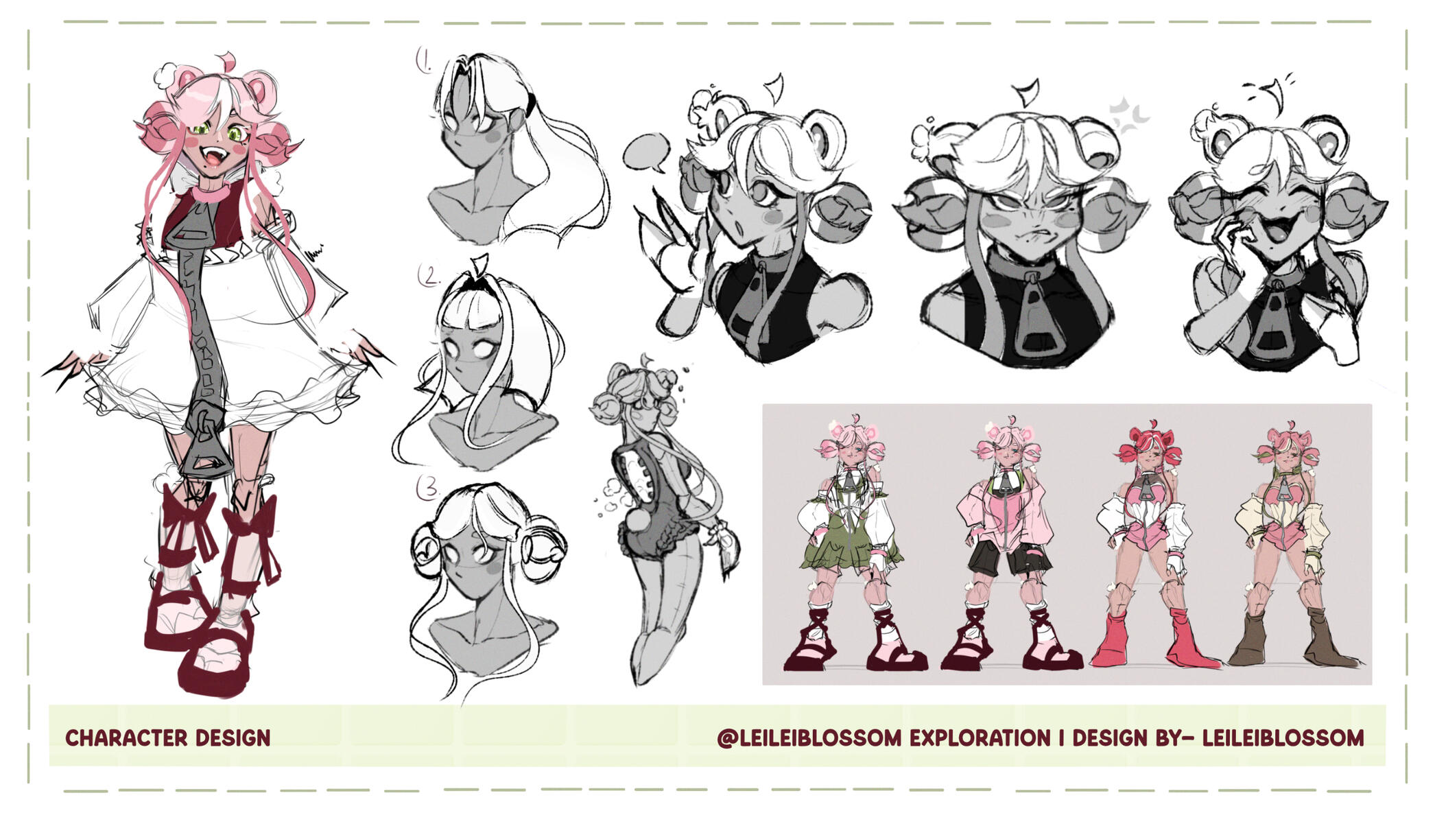 - Includes callouts like eye shape, pins, (in hair or outfit) outfit layering, and etc.