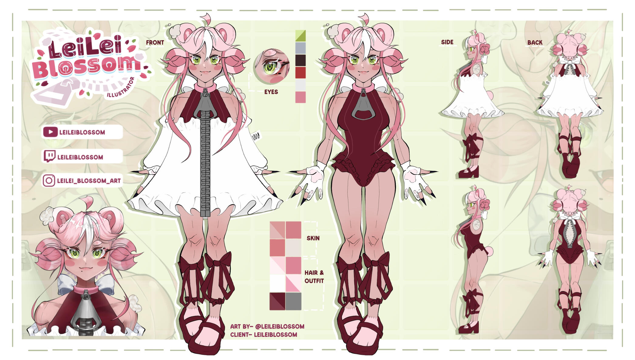 - Includes callouts like eye shape, pins, (in hair or outfit) outfit layering, and etc.